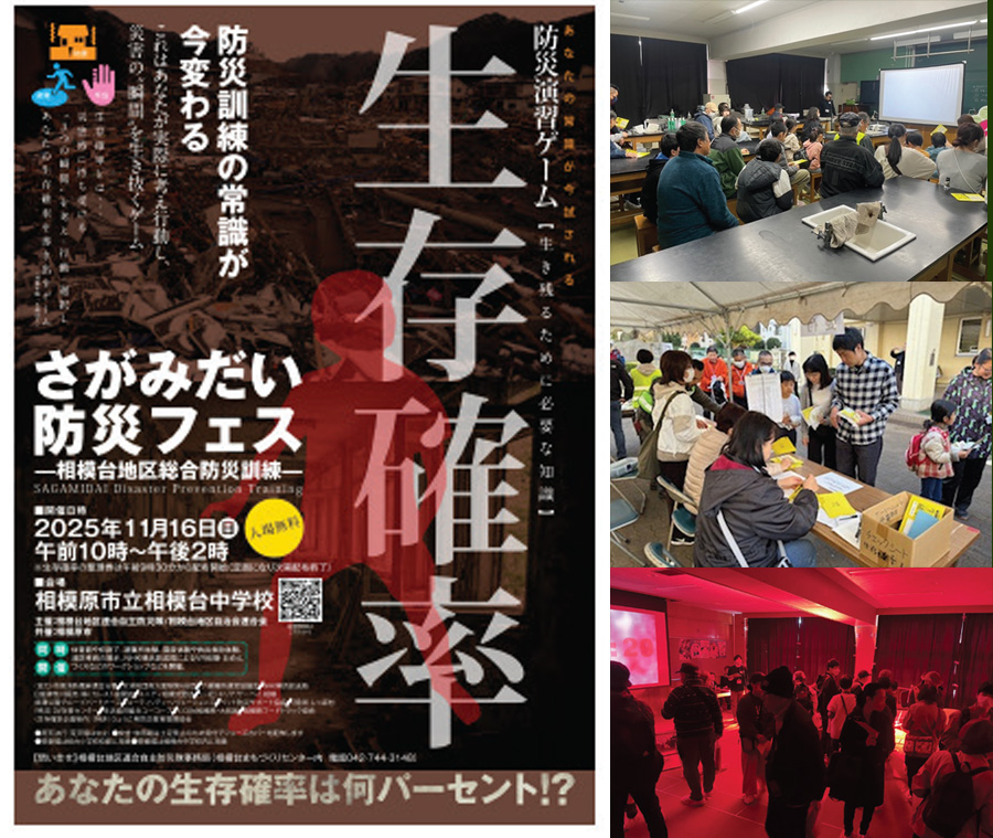 ひょうご県防災教育振興協会と共同実施 「さがみ台防災フェス」の一環として「防災演習ゲーム/生存確率」を実施。 会場となった相模台中学校には朝早くから市民の方が詰めかけていただき4時間で350名以上の参加者を記録しました。